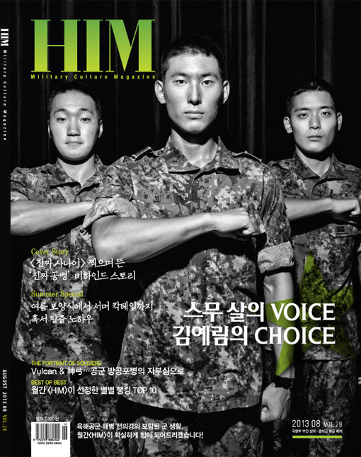 공개된 사진에는 국내 최초 병영 매거진 ‘HIM’ 8월호 커버 모델로 발탁된 설민호 분대장, 함영기 상병, 이동근 일병의 모습이 담겨 있다. 세 사람은 주먹을 쥔 채 오른팔을 심장 쪽 가슴에 올려놓고 멋진 포즈를 취하고 있다.
