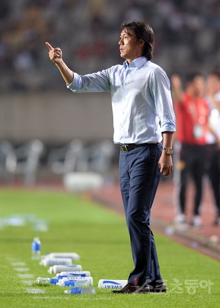 홍명호 감독이 6일 페루전 명단 발표를 앞두고 저조한 득점력 해소를 위해 어떤 대안을 내놓을지 관심이 쏠리고 있다. 홍 감독이 7월24일 중국전에서 선수들의 위치를 잡아주고 있다. 스포츠동아DB