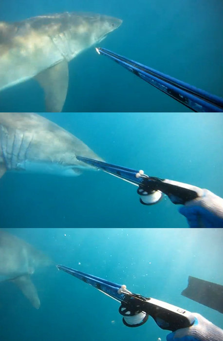 이 주인공은 자신이 가지고 있던 작살로 백상아리를 살짝 찔렀다. 이에 백상아리는 별 다른 저항없이 방향을 돌려 남자는 화를 면했다.