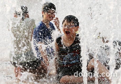 불별더위가 기승을 부린 8일 오후 서울 시청광장 분수대에서 어린이들이 즐거운 시간을 보내고 있다. 이날 울산의 낮 기온이 38.8도까지 오르는 등 가장 무더운 날씨를 보였다.