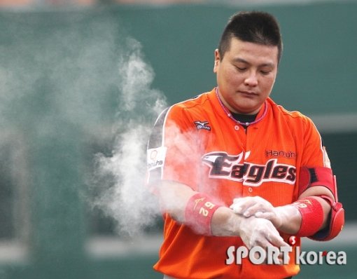 ‘2013 프로야구 한화 이글스 대 넥센 히어로즈’의 경기가 11일 오후 목동구장에서 열렸다. 3회초 김태균이 타석에 들어서기 전 분진가루를 바르며 결의를 불태우고 있다.