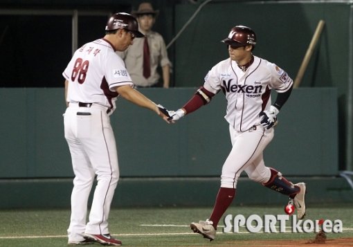 6회 말 무 넥센 문우람이 한화 선발 유창식을 상대로 솔로 홈런을 친 후 심재학 코치의 축하를 받고 있다.