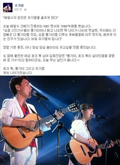 이어 “배철수 선배가 진행하는 KBS ‘콘서트 7080’ 녹화를 했습니다. 배철수 선배는 ‘요즘 신인가수들이 통기타하나 메고 나오면 뭐 난리가 나는데 옛날엔, 우리 때는 간첩 빼곤 다 통기타를 쳤죠, 요즘 통기타를 다루는 후배들 중에 아주 멋지게, 예쁘게 치는 친구가 있습니다. 바로 추가열씨 입니다’ 정말 기분 좋은, 아니 덩실 덩실 춤이라도 추고 싶을 만큼 좋았습니다”라며 선배의 칭찬에 기쁨을 감추지 못했다.