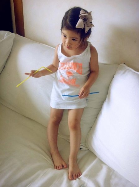 뮤지 딸은 소파에 올라가 양손에 노란색과 파랑색 빨대를 각각 들고 있다. 흰색 원피스를 입고 머리에 핀까지 꽂은 뮤지 딸은 미소를 자아낸다. 뮤지와 닮은 듯 하면서도 사랑스럽고 예쁜 뮤지 딸은 보는 이들의 시선을 사로잡고 있다.