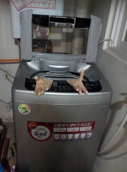 사진에는 뚜껑이 열린 세탁기에 널려있는 고무 장갑을 볼 수 있다. 그런데 이 모습이 마치 세탁기 안에서 사림의 손만 나와 있는 것 같은 착각을 불러와 눈길을 끈 것.