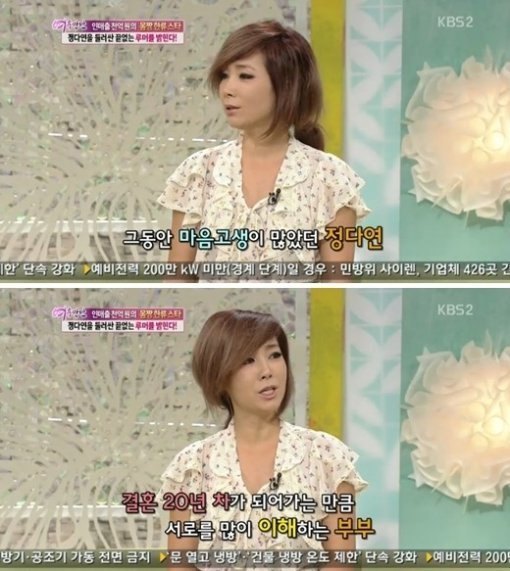 이날 방송에서 정다연은 "유명해지기 훨씬 전, 남편의 사업부도 위기로 서류상 이혼을 했다. 어쩔 수 없는 선택이었지만 경솔했었다"고 설명했다.