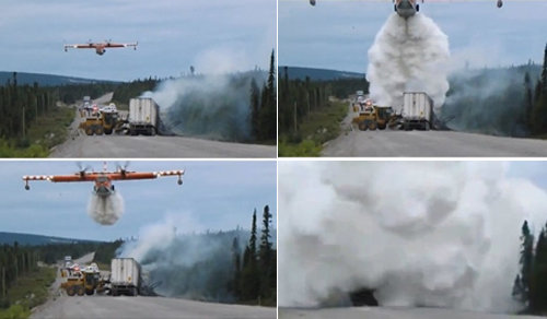 ‘소방 비행기의 위력’ 동영상은 최근 캐나다 처칠폭포 인근의 고속도로에서 발생한 화물차와 트럭의 추돌 사고를 담은 동영상이다.
