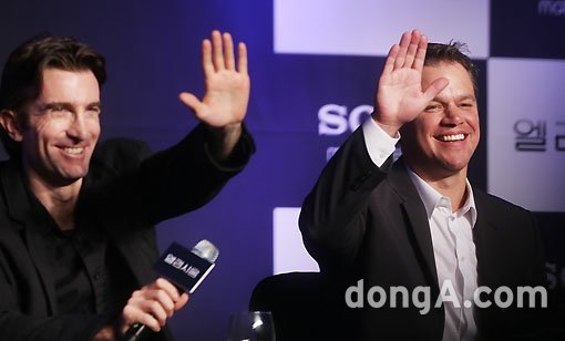 배우 샬토 코플리(왼쪽)와 맷 데이먼이 14일 오전 서울 여의도 콘래드호텔에서 열린 외화 ‘엘리시움’ 공식기자회견에 참석해 취재진을 향해 인사를 하고 있다.