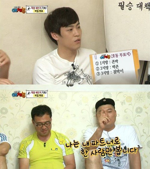 강호동은 “3지망 모두 같은 사람을 썼다”며 “내 파트너로 한 사람만 봅니다. 그게 어긋났을 때 한 사람만 팹니다”라고 말했다.