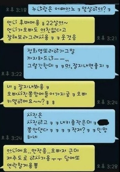 메시지 속 남성은 “누나랑은 어떻게 아니? 몇 살이야?”라고 문자를 보낸다. 이에 여성은 “언니 후배예요. 22살요”라고 대답한다. 하지만 이어 남성이 “내키 좀 작은데ㅋ ** 좀 안 된다. 작지? 민망하네”라고 문자를 보내자 여성은 “아니에요, 안 작아요, 오빠 저 근데 제주도로 이사가요. 다음에 또 연락할게요”답해 웃음을 자아냈다.