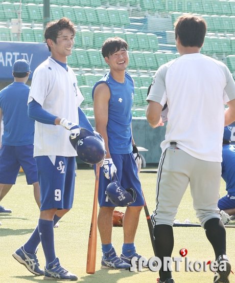 ‘2013 한국야쿠르트 세븐 프로야구’ 삼성 라이온즈와 LG 트윈스의 경기가 14일 오후 대구 시민야구장에서 열린다. 경기전 훈련에 나선 삼성 강명구, 김상수가 LG 이진영과 반갑게 인사를 나누고 있다.
