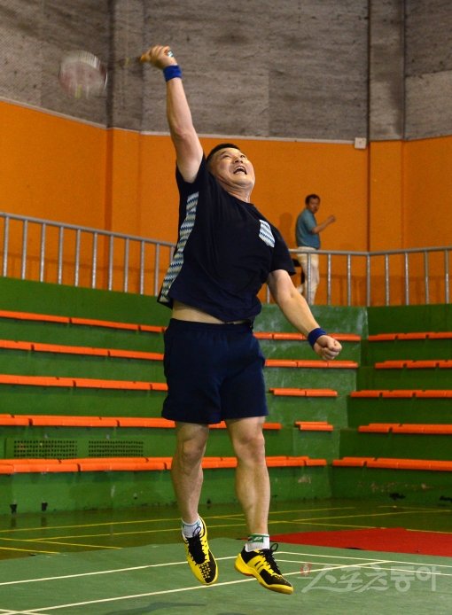 14일 오후 서울 강서구 KBS스포츠월드 제2체육관에서 열린 KBS 2TV ‘우리동네 예체능’ 현장공개에서 강호동이 배드민턴 공격을 펼치고 있다.