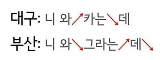같은 경상도 지역이지만 대구와 부산 사투리는 미묘한 차이점을 보인다. 먼저 대구 지역은 ‘니 와↗ 카는↘데’라며 ‘와’에서는 억양을 높이고, ‘는’에서는 내린다.