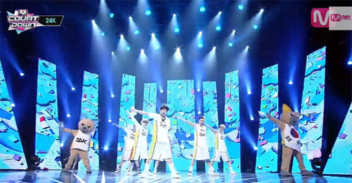 24K는 광복절인 15일 생방송한 케이블채널 엠넷 ‘엠카운트다운’에서 무대의상에 태극기를 부착한 모습을 선보였다.
