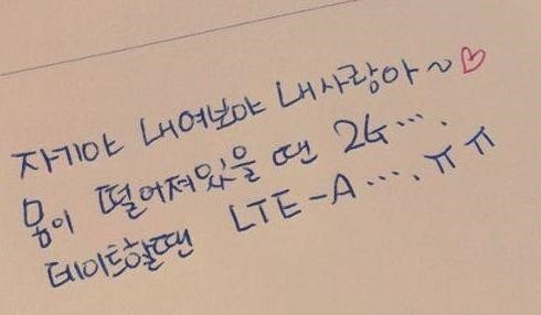 ‘연인들 공감 속도’사진 속에는 여자친구가 남자친구에게 쓴 편지가 있었다. ‘연인들 공감 속도’에서 여자는“몸이 떨어져 있을 땐 2G, 데이트할 땐 LTE-A”라고 적혀 있어 웃음을 자아냈다.