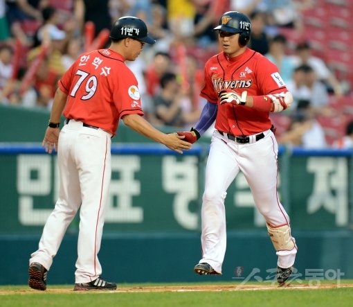 18일 오후 서울 잠실야구장에서 ‘2013 한국야쿠르트 세븐 프로야구’ 두산 베어스와 SK 와이번스의 경기가 열렸다. 4회초 1사 1루에서 SK 최정이 두산 선발 이재우를 상대로 시즌 23호 좌월 투런홈런을 쏘아올린 뒤 한혁수 코치의 환영을 받고 있다.