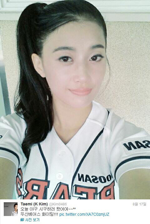 태미는 지난 18일 자신의 트위터에 “오늘 야구 시구하러 왔어요. 두산 베이스 화이팅!”이란 글과 함께 사진을 올렸다.
