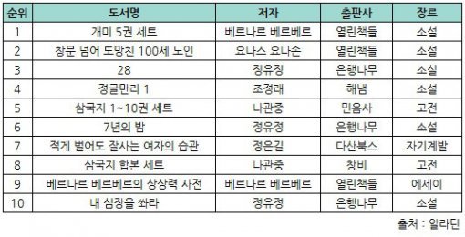 인터파크, 리디북스에는 ‘창문 넘어 도망친 100세 노인(요나스 요나손, 열린책들)’이 신간으로 등장했다. 이 책은 인구 900만의 스웨덴에서 100만 부, 전 세계에서 500만 부 이상이 팔리며 화제를 모은 소설이다. 주인공 알란은 100세 생일날 슬리퍼 바람으로 양로원의 창문을 넘어 탈출을 하는데, 우연히 갱단의 돈가방을 손에 넣게 된다. 그리고 자신을 추적하는 무리를 피해 도망길에 나선다. 저자는 이를 통해 1905년 스웨덴의 한 시골 마을에서 태어난 노인이 살아온 백 년의 세월을 유쾌하게 그려냈다.