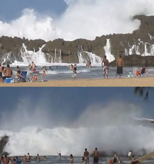 공개된 영상에는 푸에르토리코의 한 해변이 담겨 있다. 바다의 석회석에 바닷물이 부딪힐 때 마다 물을 쏟아내는 것처럼 보여 ‘폭포 쏟아지는 바닷가’란 이름이 붙었다. 폭포를 만들어 내는 석회석은 파도로부터 관광객들을 보호해 주는 역할을 한다고.