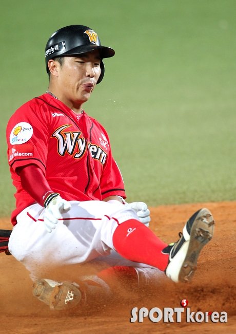 20일 오후 대구 시민구장에서 열린 ‘2013 한국야쿠르트 세븐 프로야구’ 삼성 라이온즈와 SK 와이번스의 경기에서 SK 1번 정근우가 5회초 2사 2루 때 1타점 3루타를 치고 3루에 슬라이딩하고 있다.