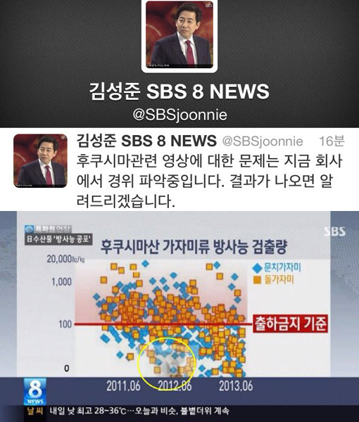 이와 관련해 김성준 앵커는 방송 직후 트위터를 통해 “후쿠시마 관련 영상에 대한 문제는 지금 회사에서 경위 파악중입니다. 결과가 나오면 알려드리겠습니다”라는 글을 남겼다.