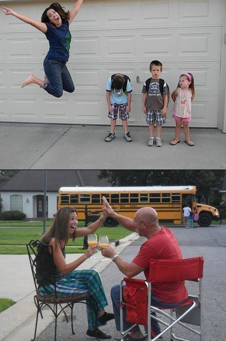 사진에는 개학을 맞아 시무룩한 표정의 아이들과 달리 하늘을 날 듯 점프하고 있는 엄마의 모습부터 아이들을 스쿨버스에 태워보낸 부부가 주스로 건배를 하고 있다.