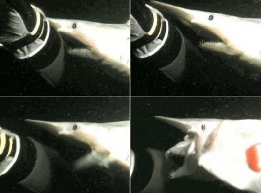 공개 된 영상에는 상어가 다이버를 물기 위해 입을 벌리고 다가가는 모습이 담겨 있다. 특히 상어가 무는 순간에 입 안에서 또다른 입과 이빨이 나와 누리꾼들을 경악케 했다.
