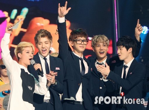 EXO(엑소)가 21일 서울 광진구 악스홀에서 열린 MBC 뮤직 ‘쇼챔피언’에 출연해 1위를 차지한 후 기쁨을 나누고 있다.