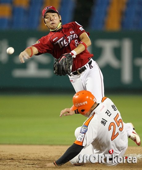 22일 오후 대전 한밭야구장에서 ‘2013 한국 야쿠르트 세븐 프로야구’ 한화이글스와 KIA타이거즈의 경기가 열렸다. 3회말 1사 1, 3루 상황에서 한화 김태균의 타구를 잡은 KIA 안치홍이 2루에서 1루 주자 최진행을 포스아웃 시킨 후 1루로 송구하고 있다. 그러나 안치홍의 악송구로 타자 주자는 세이프되고 3루 주자 한상훈이 홈을 밟았다.