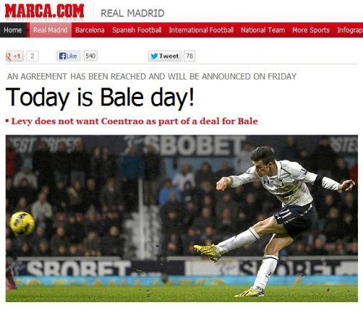 스페인 언론 ‘마르카’는 ‘오늘은 베일의 날’이라는 제목으로 그의 이적에 대해 보도했다.