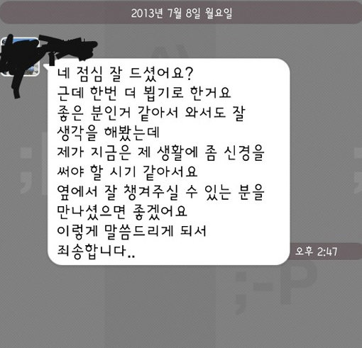이어 “좋은 분인거 같아서 돌아와서도 잘 생각을 해봤는데, 제가 지금은 제 생활에 신경을 써야 할 시기 같아요. 옆에서 잘 챙겨주실 수 있는 분을 만나셨으면 좋겠어요”라고 정중하게 거절의사를 표현했다.