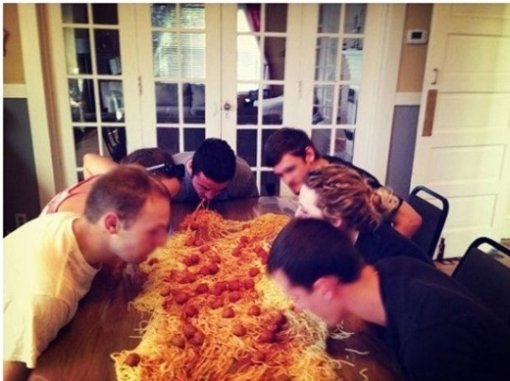 이들은 그릇 없이 식탁 위에 음식을 그대로 올려놓고 입으로 직접 먹고 있다. 식탁 위에는 그릇은 물론 식기도 전혀 보이지 않아 음식을 먹고 난 후에도 설거지할 필요가 없다. 이 가족의 엽기적인 모습에 ‘설거지 안 하는 가족’이라는 제목이 붙었다.