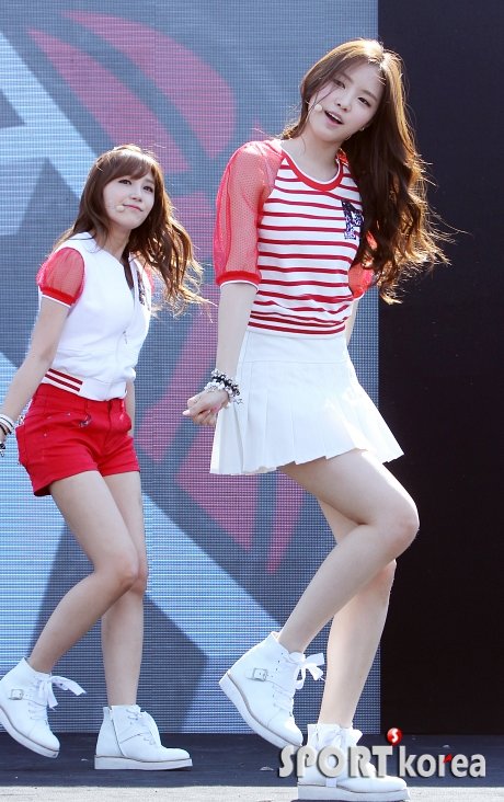 에이핑크 손나은, 정은지(왼쪽)가 25일 오후 서울 여의도공원에서 열린 ‘스프라이트와 함께 하는 2013 NBA 3X Korea 길거리 농구대회’에 참석해 축하공연을 펼치고 있다.