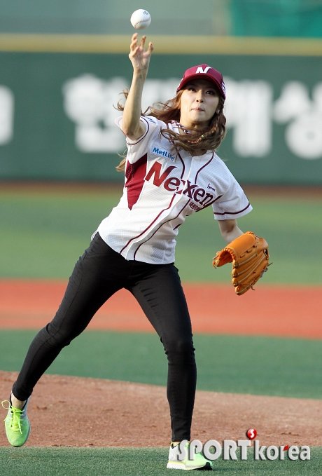 25일 오후 서울 목동야구장에서 ‘2013 한국 야쿠르트 세븐 프로야구’ 넥센히어로즈와 KIA타이거즈의 경기가 열렸다. 경기 시작 전 걸그룹 리브하이 A.지아가 멋진 시구를 선보이고 있다.