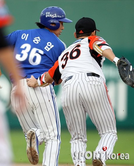 25일 오후 부산 사직구장에서 열린 ‘2013 한국야쿠르트 세븐 프로야구’ 롯데 자이언츠와 삼성 라이온즈의 경기 삼성 2회초 무사 1루에서 5번 박석민의 삼진아웃 때 1루주자 이승엽이 1,2루 사이에서 롯데 박종윤에게 태그아웃 되고 있다.