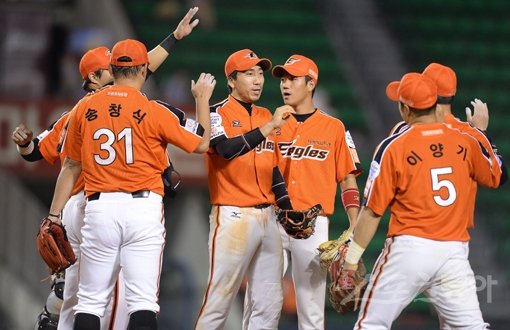 ‘2013 한국야쿠르트 세븐’ 프로야구 한화이글스 대 두산베어스 경기가 25일 서울 잠실야구장에서 열렸다. 3-2 승리를 거두며 3연승을 달린 한화 선수들이 경기 종료 후 하이파이브 하고 있다. 잠실|김종원기자 won@donga.com 트위터@beanjjun