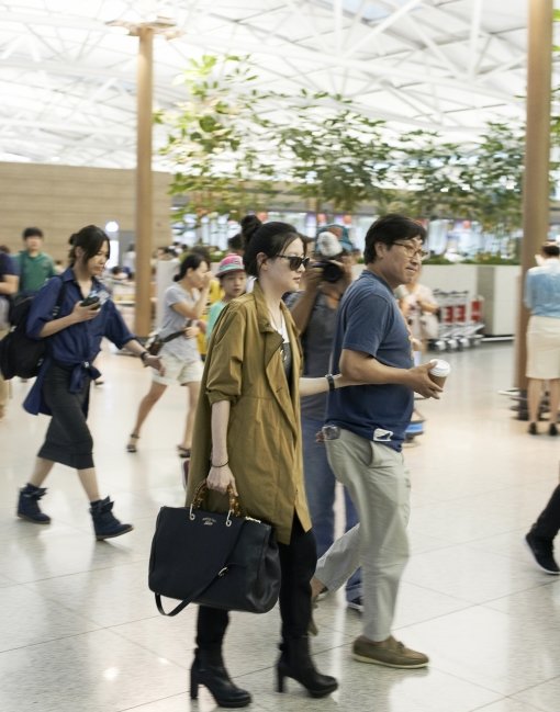이영애의 공항패션은 편안하지만 시크한 멋이 풍겼다. 가벼운 외투, 블랙 팬츠와 슈즈, 포인트로 뱀부 핸들 디자인이 독특한 블랙 레더 소재의 쇼퍼 백이 우아하면서 청초한 그녀의 시그니처 룩을 완성 시켰다.
