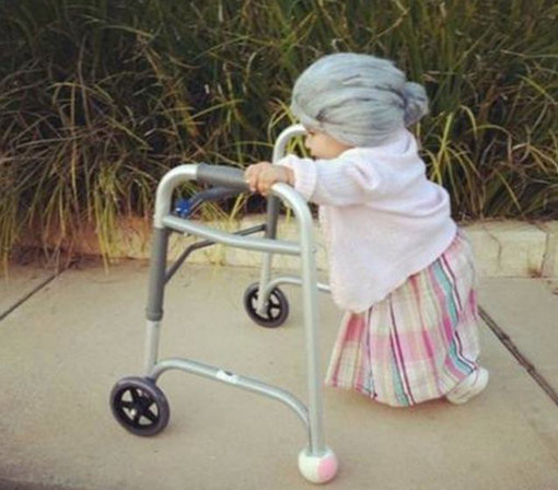 공개된 사진에는 보행 보조기구에 몸을 의지하고 백발 머리 가발을 쓰고 노인 코스프레를 한 아기의 모습이 담겨있다. 귀엽고 앙증맞은 모습이 웃음을 준다.