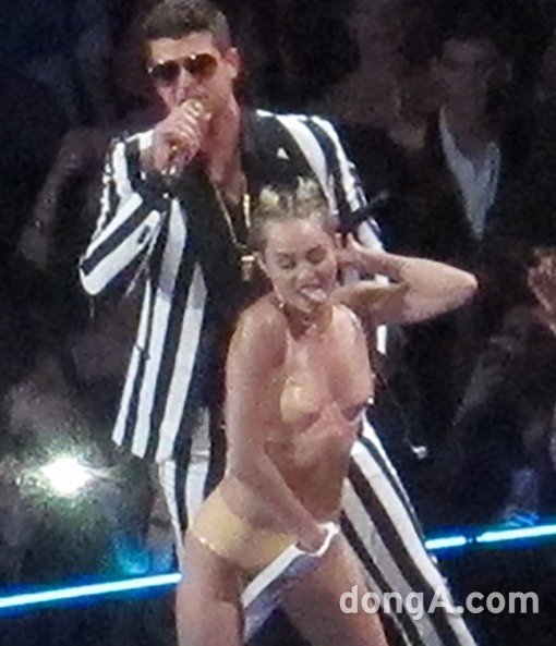 공개된 사진에는 마일리 사이러스와 로빈 시크의 콜라보레이션 무대 모습이 담겨 있다. 이때 마일리 사이러스의 다소 충격적인 행동이 눈길을 끈다. 로빈 시크와 ‘성 행위’를 무대에서 묘사한 것.