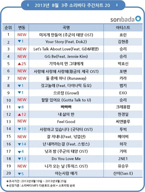 한편 씨엔블루의 ‘Feel Good’(13위), 메이비의 ‘잘 지내니’(15위), <투윅스> OST인 유승우의 ‘니가 오는 날’(19위)이 주간차트 20위권 내에 진입했다.