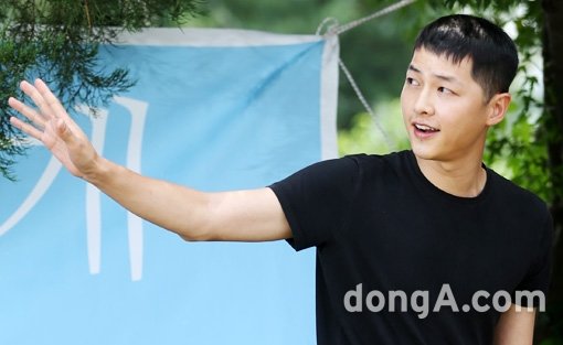 차에서 내린 그는 남색 모자에, 남색 티셔츠, 청바지에 스니커즈로 편안한 차림이었다. 송중기는 짧은 머리가 아직 어색한 듯 모자를 벗어달라는 취재진의 요청에 모자를 벗고 머리를 계속 긁적였다.
