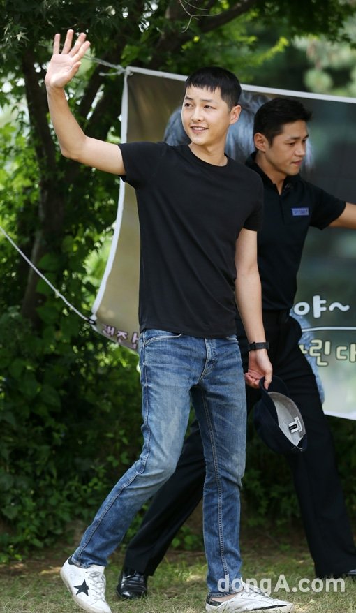 배우 송중기가 27일 오전 강원도 춘천 102보충대 앞에서 입대하기 전에 팬들에게 인사를 하고 있다.