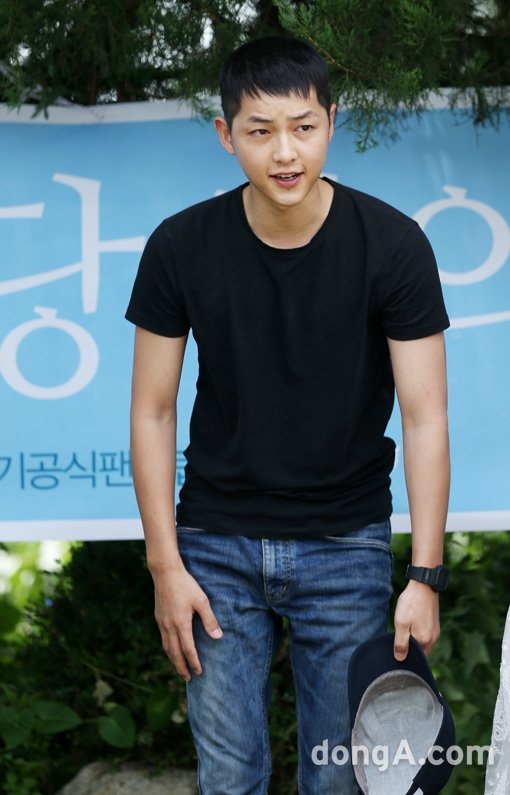 배우 송중기가 27일 오전 강원도 춘천 102보충대 앞에서 입대하기 전에 팬들에게 인사를 하고 있다.