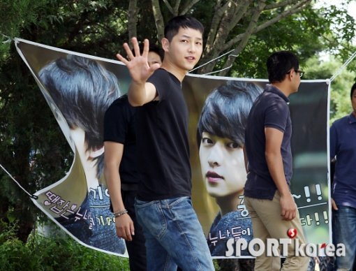 송중기의 입대 현장에는 그를 배웅하기 위해 국내·외 팬들 100여 명이 몰려 인산인해를 이뤘다.