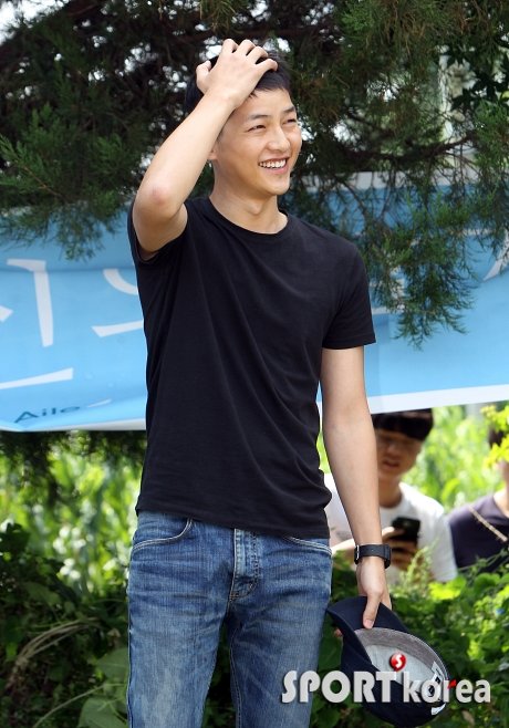 배우 송중기가 27일 오후 강원도 춘천 102 보충대로 입소하기 전 모자를 벗으며 쑥스러워하고 있다.