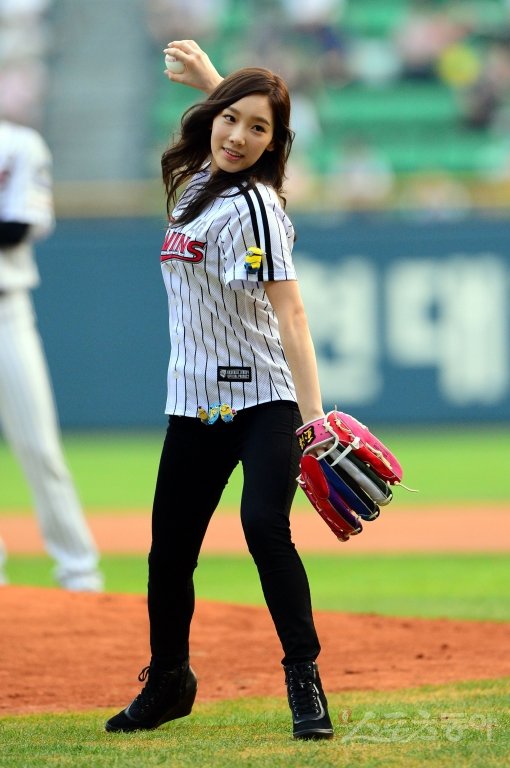 27일 저녁 서울 잠실야구장에서 열린 2013프로야구 LG와 넥센의 경기에서 소녀시대 태연과 서현이 시구와 시타를 했다. 태연이 시구를 하고 있다.