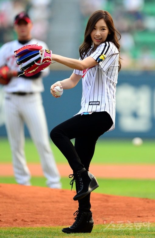 27일 저녁 서울 잠실야구장에서 열린 2013프로야구 LG와 넥센의 경기에서 소녀시대 태연과 서현이 시구와 시타를 했다. 태연이 시구를 하고 있다.