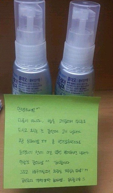 하지만 붙어 있는 쪽지에는 “다름이 아니라 밥을 고깃집에서 식사류로 드시고 오시는 것 같던데 고기 냄새가 조금 심하다. 좀 번거로우시더라도 들어오시기 전에 이걸 몇 번 뿌려주시면 냄새가 안 날 것 같다”고 적혀있어 웃음을 자아낸다.