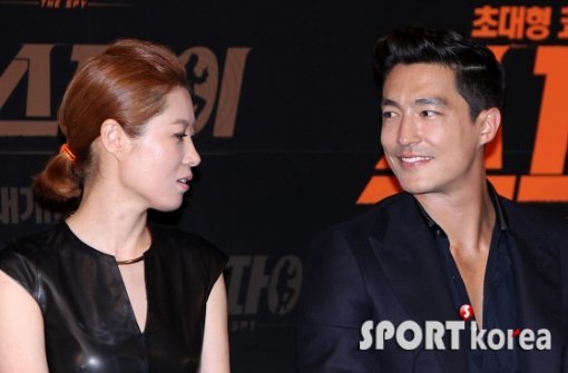 배우 문소리, 다니엘 헤니(오른쪽)가 28일 오후 서울 왕십리 CGV에서 열린 영화 ‘스파이’ 언론시사회에 참석해 서로를 바라보고 있다.