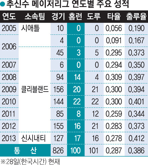 이로써 추신수는 2005년 메이저리그에 데뷔한 이후 9시즌 826경기 만에 개인통산 100호 홈런을 달성했다. 2006년 시애틀에서 클리블랜드로 트레이드된 그는 7월 29일 친정팀을 상대로 메이저리그 데뷔 홈런을 쏘아 올렸다. 2008년에는 처음으로 두 자릿수(14개) 홈런을 때려냈고, 이듬해인 2009년에는 20홈런 고지에도 올랐다. 2011년 4년 연속 두 자릿수 홈런에 도전한 추신수는 시즌 도중 음주운전으로 물의를 빚고, 부진이 겹친 탓에 8홈런에 그쳤다. 그러나 지난해 다시 16개의 홈런으로 두 자릿수 아치를 그리며 정상궤도를 되찾았다.